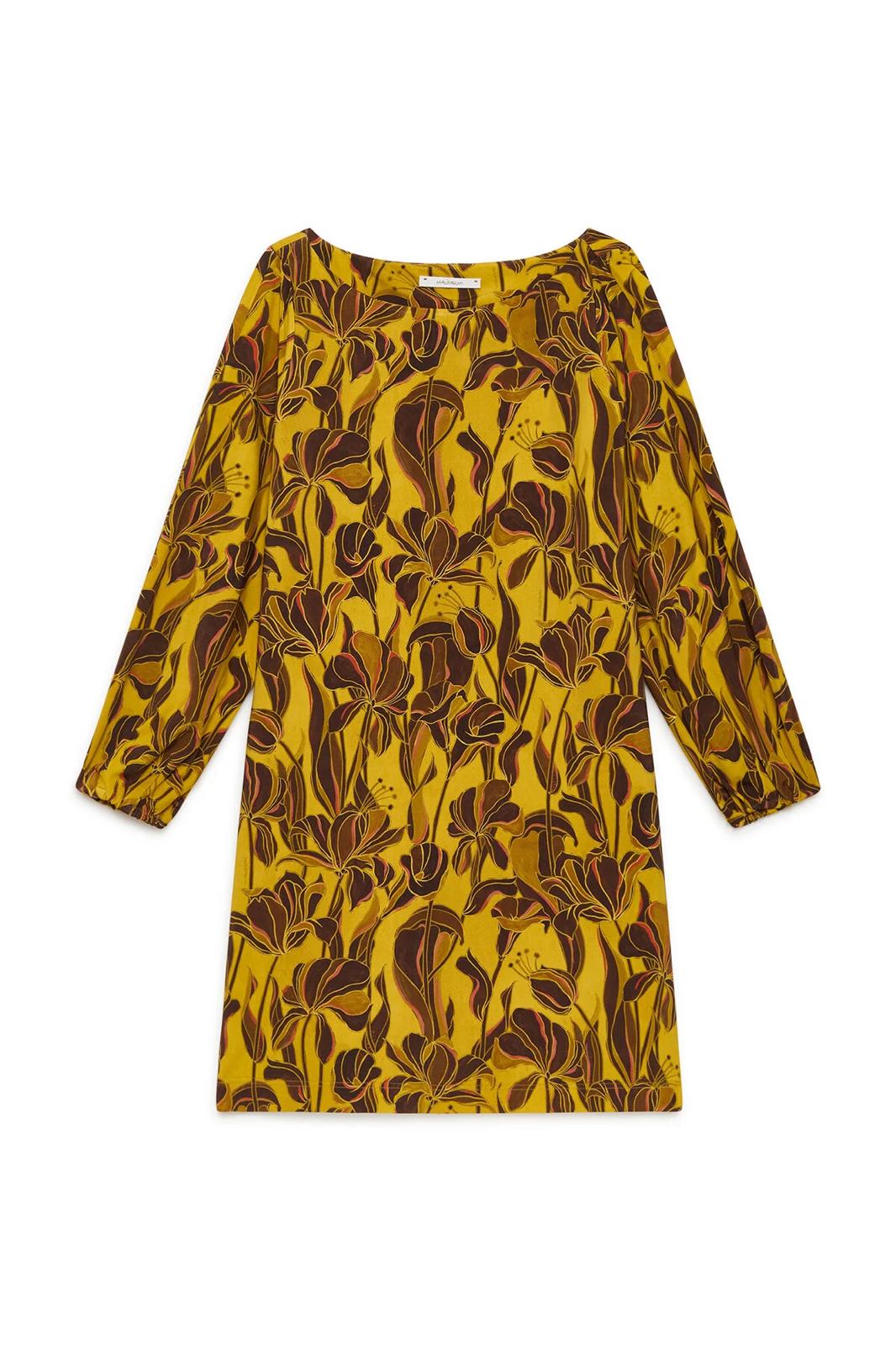 Abito in morbido Jersey stampato , scollo a barca , manica lunga , ampia al fondo , chiusa da un elastico al polso