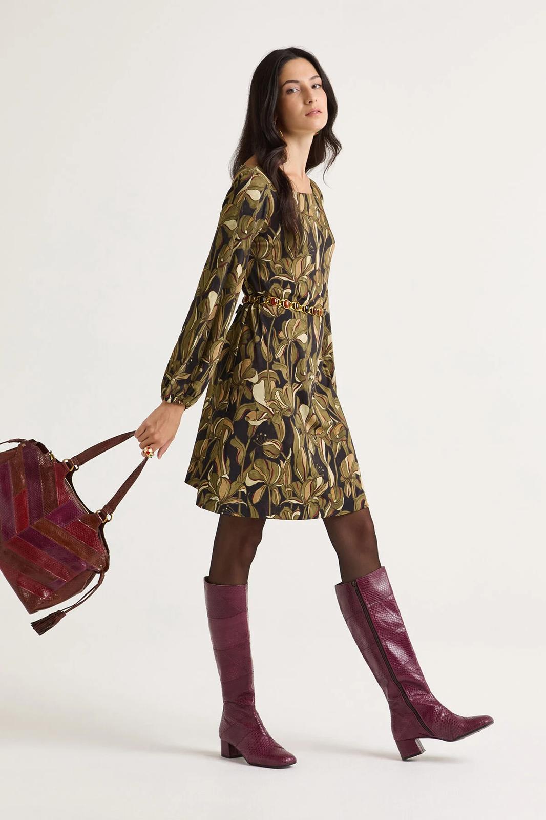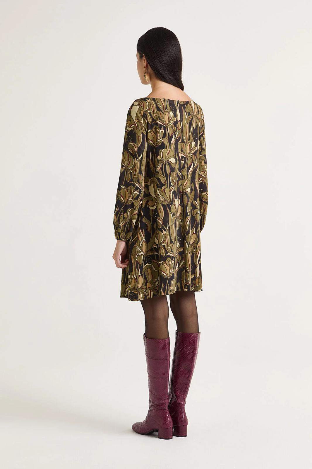 Abito in morbido Jersey stampato , scollo a barca , manica lunga , ampia al fondo chiusa da elastico