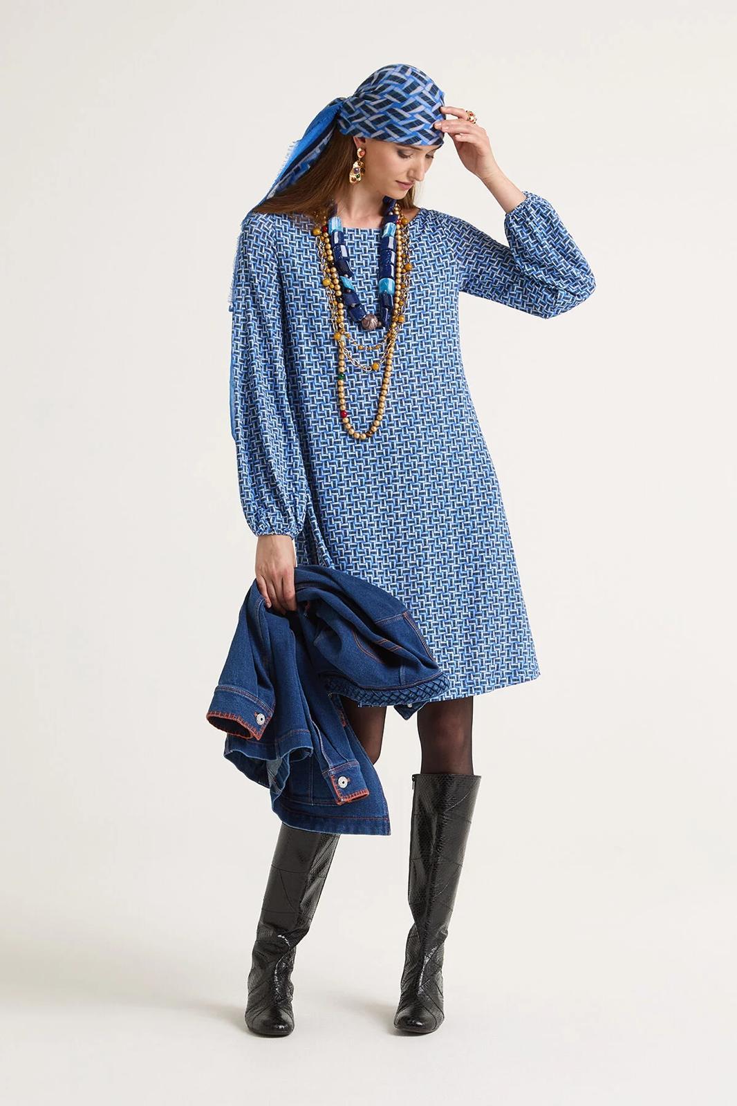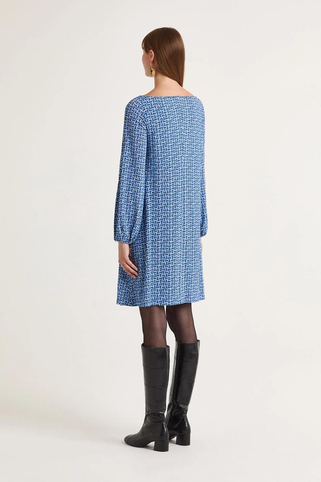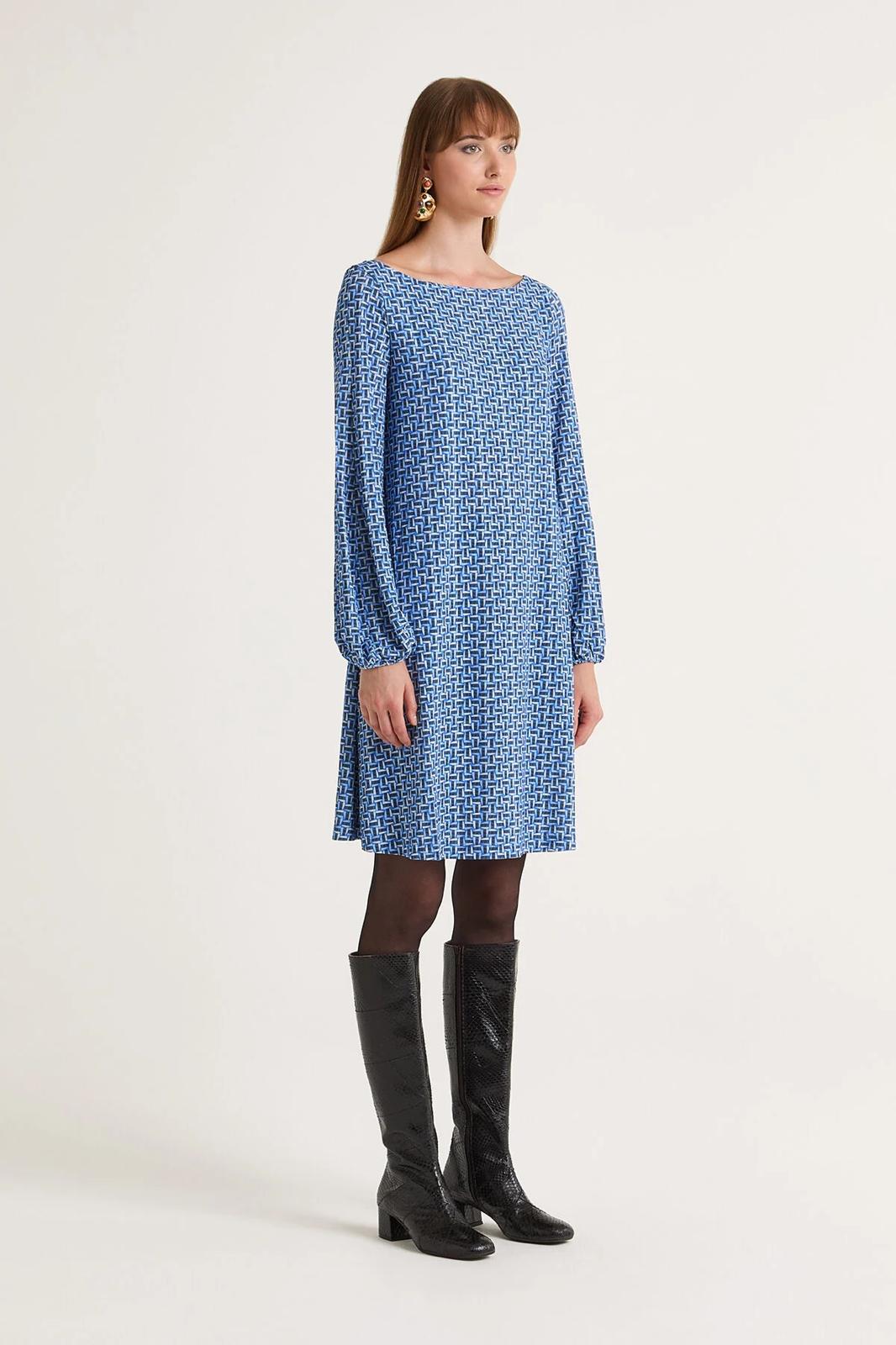 Abito in morbido Jersey stampato in Microfantasia , scollo a barca , manica lunga che si allarga al fondo presa da elastico al polso