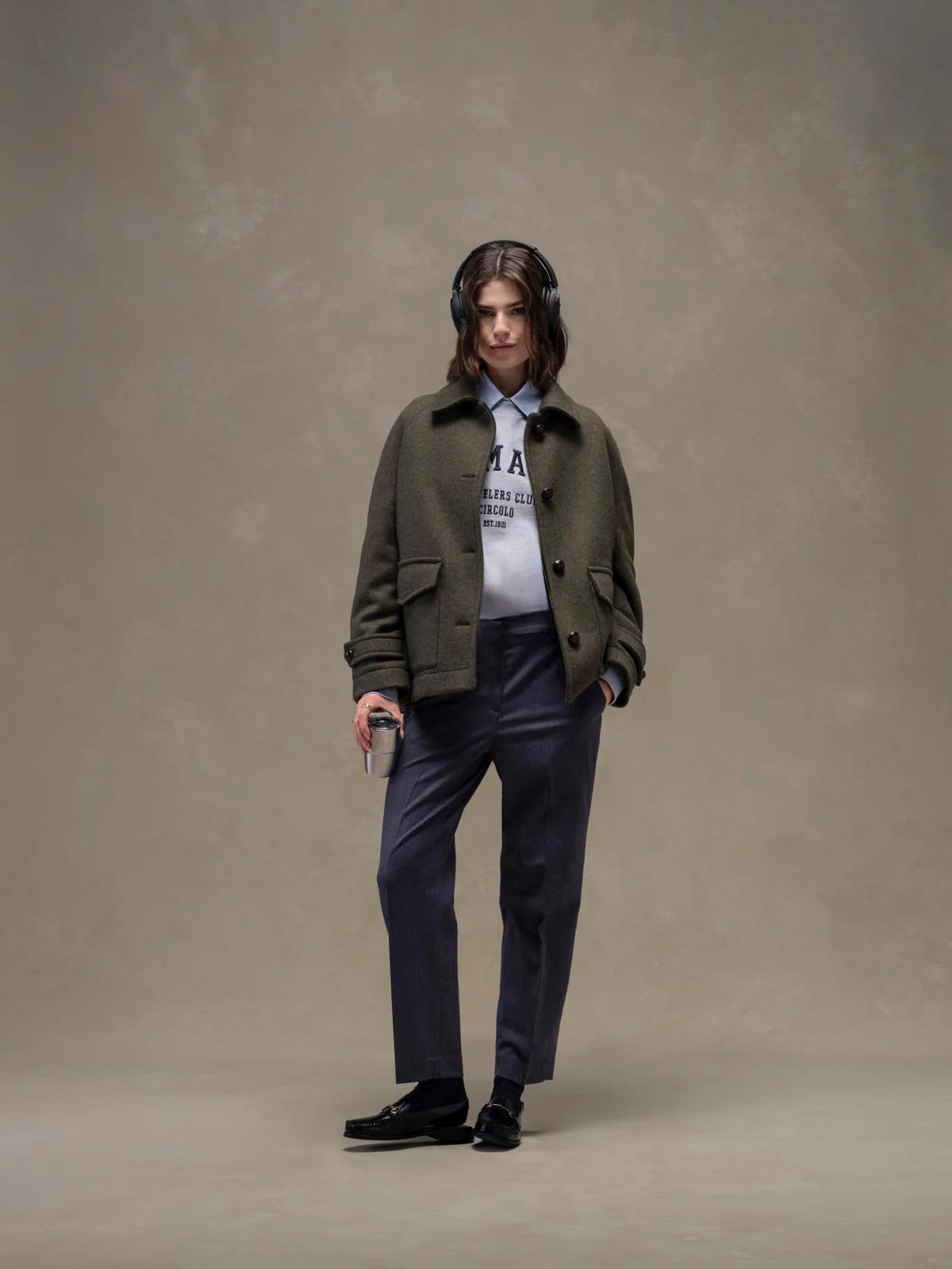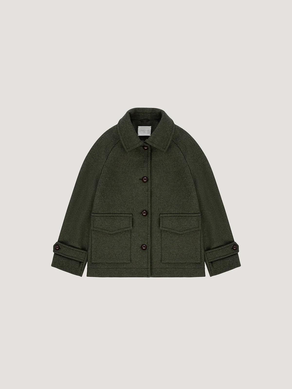 LCaban con manica a raglan , collo tondo , linea morbida che copre il fianco , ampie tasche a toppa con patte sul fondo