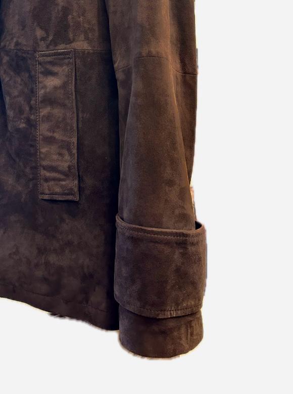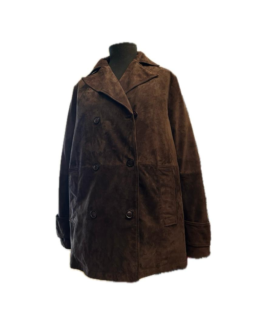Pikot in camoscio con fodera in fantasia leggermente imbottita ,doppio petto con ampio bavero , chiuso da bottoni in tinta