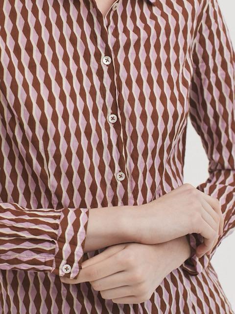 Camicia in cotone stropicciato con stampa a piccoli disegni geometrici sui toni del rosa e marrone