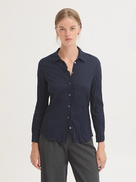 Camicia in cotone stropicciato con piccolo collo e chiusa con piccoli bottoni in madreperla
