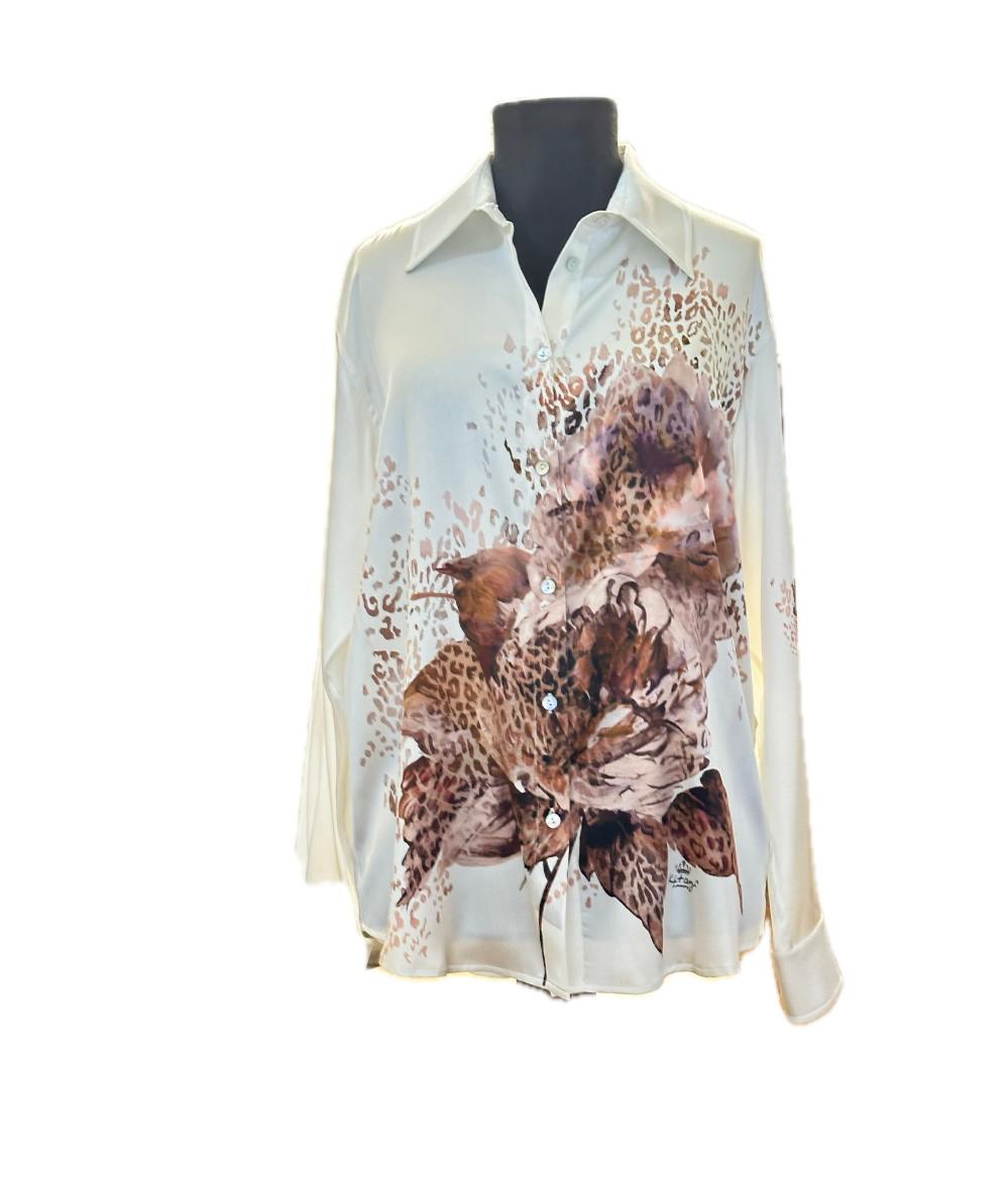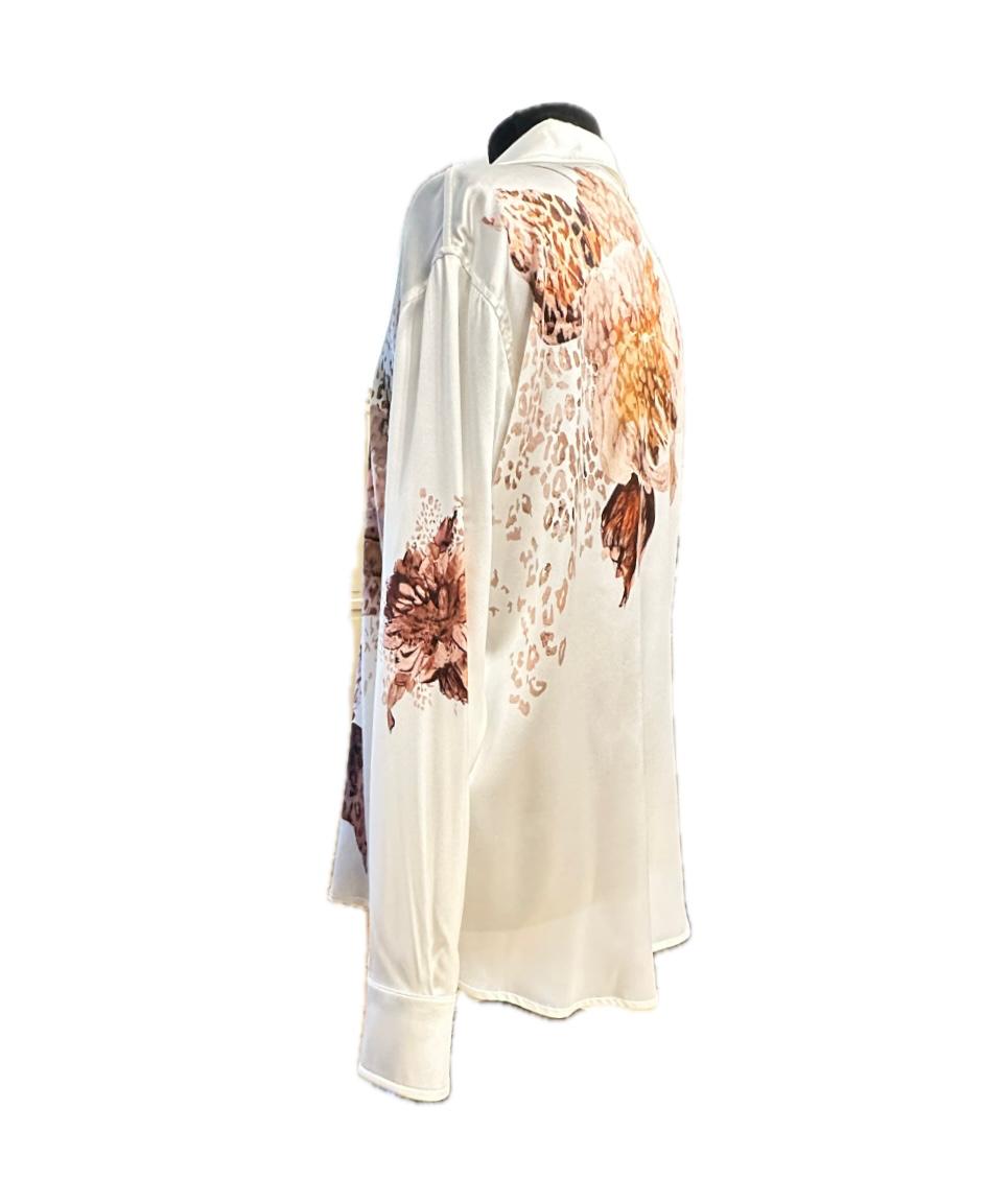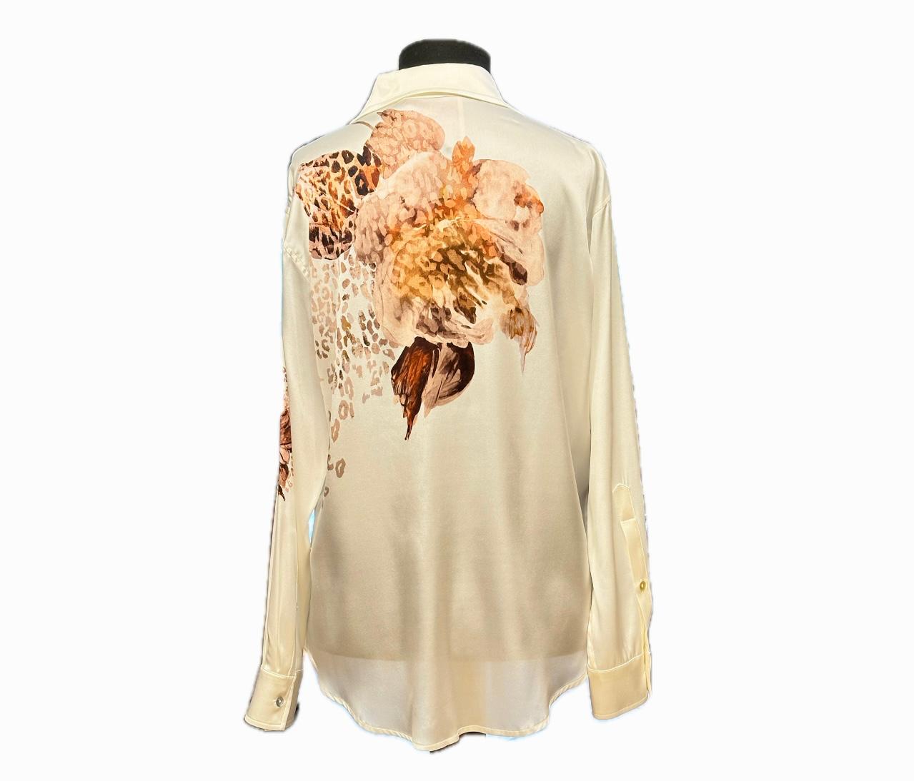 Camicia in seta , taglio maschile , linea morbida con stampa piazzata di foglie e fiori con spunti animalier