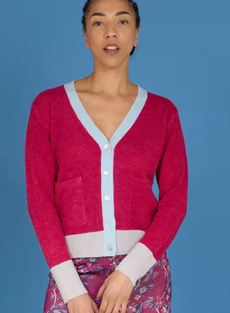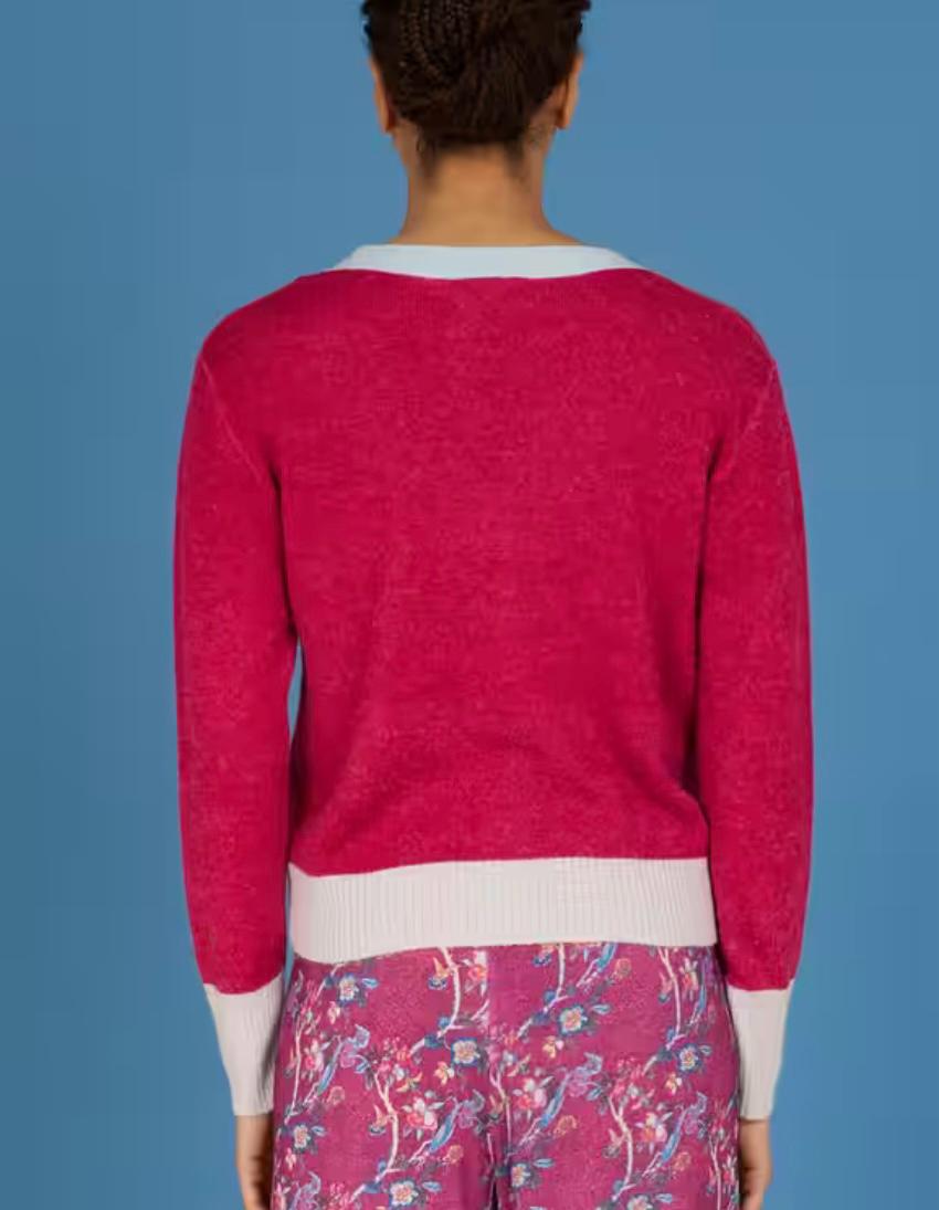 Golfino scollo V , L modello boxi , lunghezza inizio fianco , chiuso con bottoni in madreperla e bordi in contrasto di colore