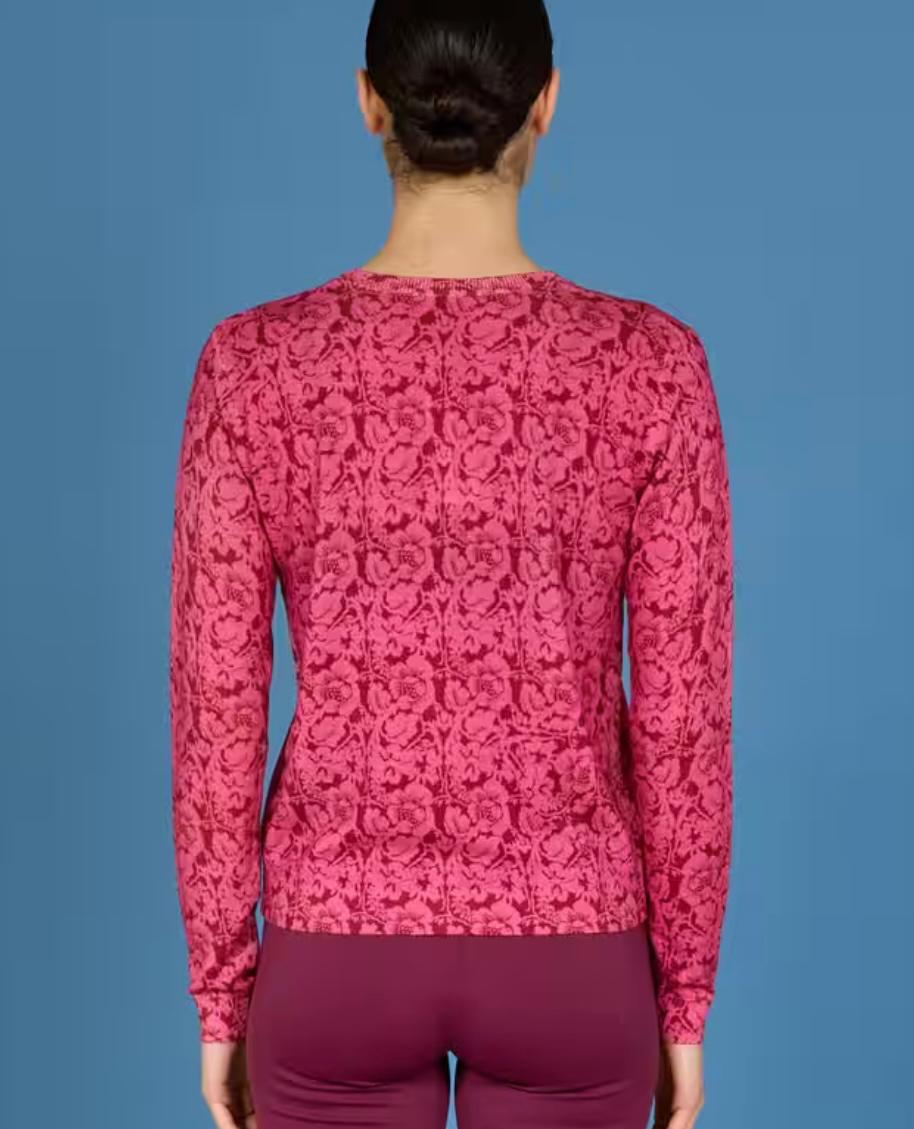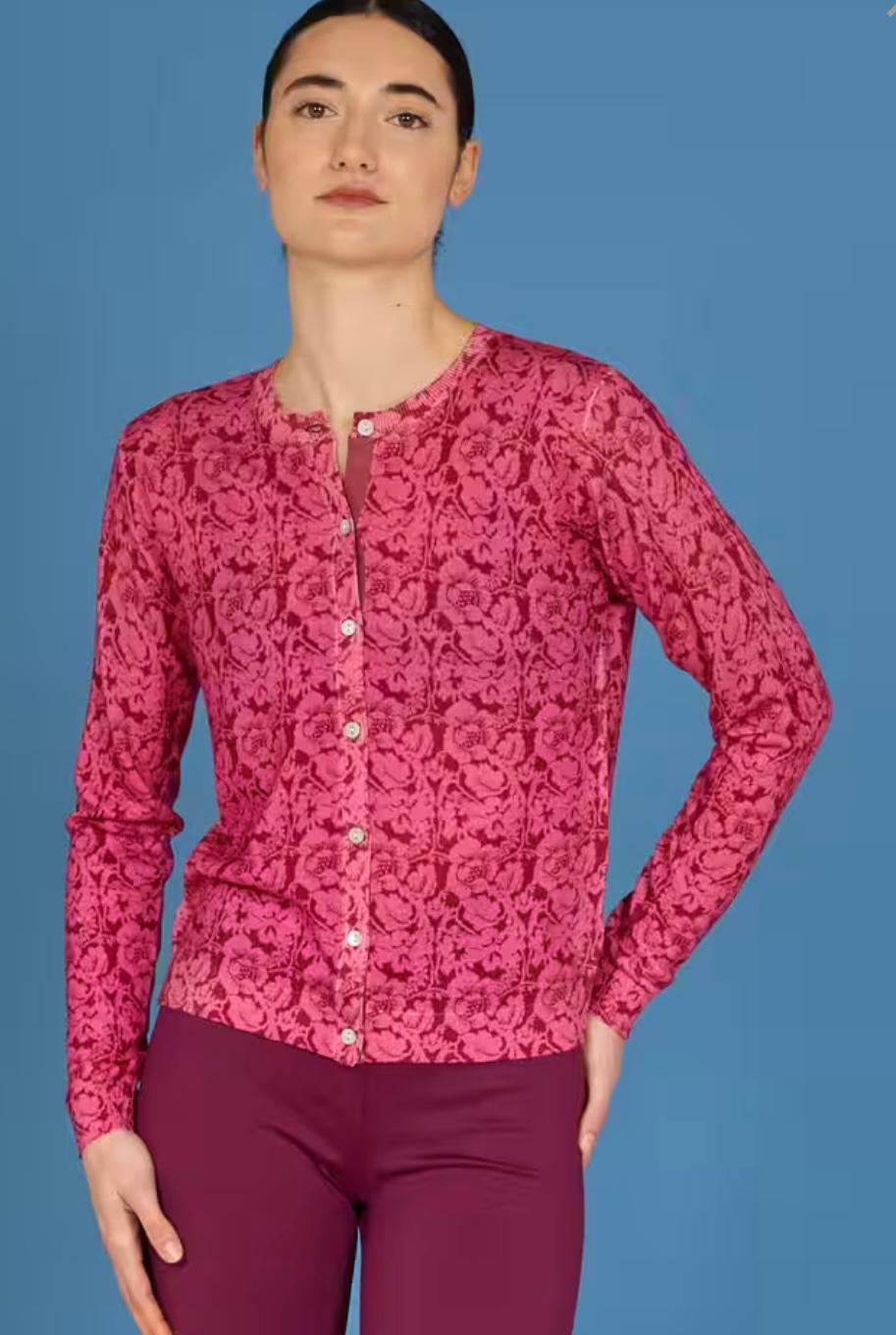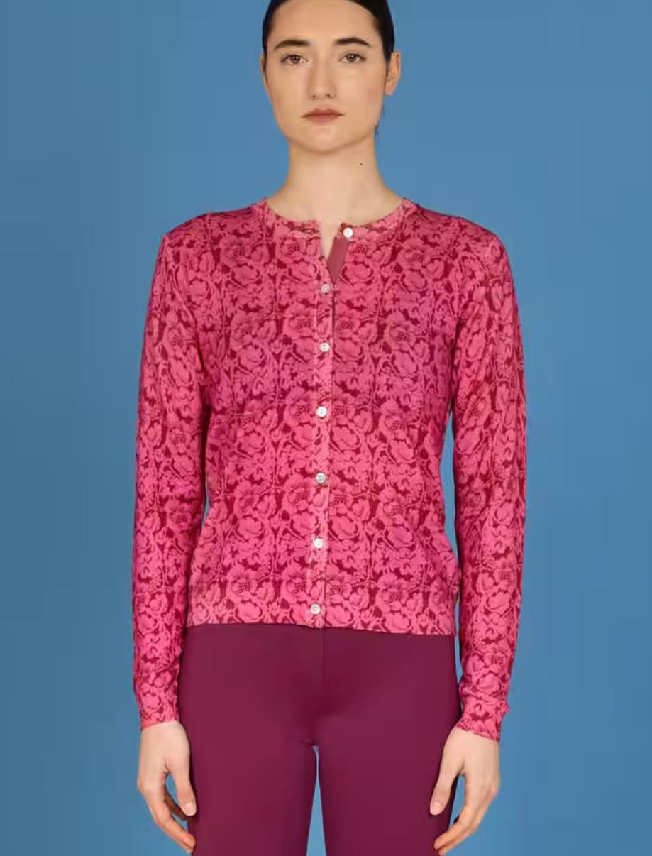 realizzato in morbida lana merinos con stampa pizzo sui toni del bordeaux e rosa fuxia