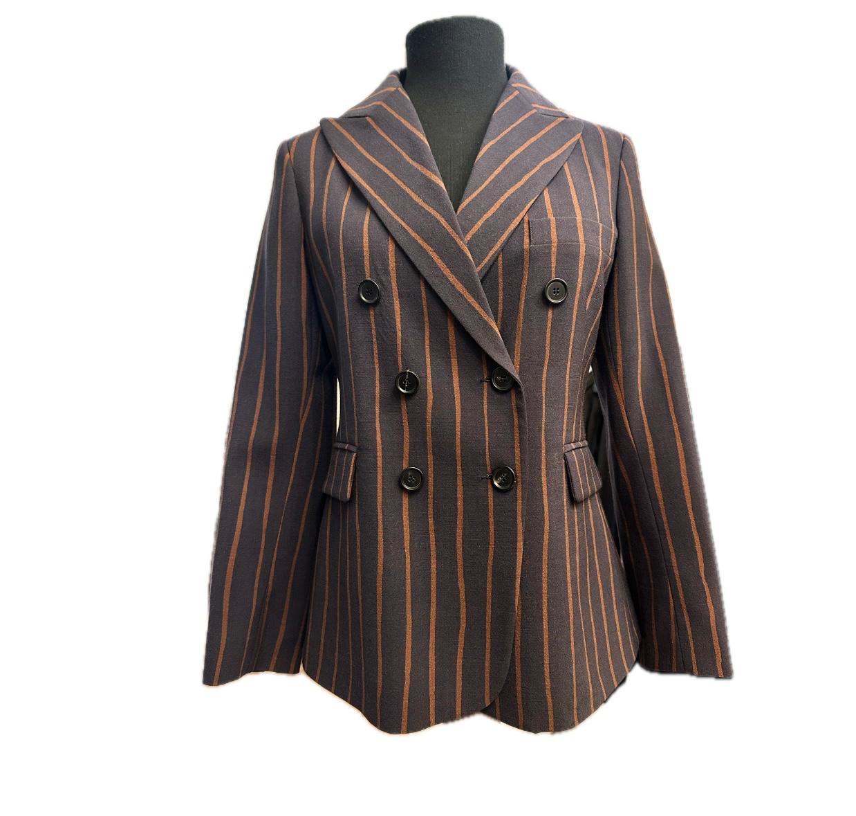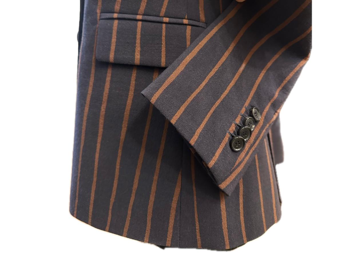 Giacca doppio petto con bavero slanciato , linea Slim , lunghezza al Bacino , costruzione sartoriale , doppia fila di bottoni in corno , tasche con patta , più taschino a filetto , fodera in fantasia in tono al gessato