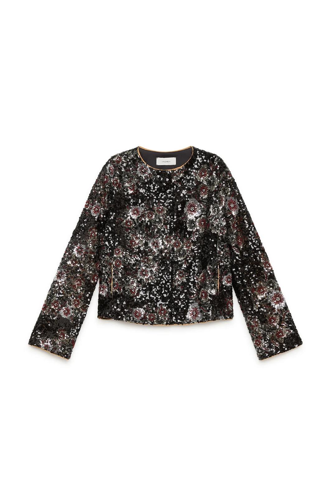 Giacca senza collo , linea boxi , con ricamo floreale di paillettes e strass