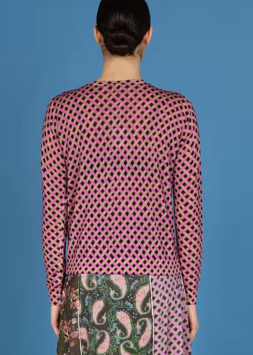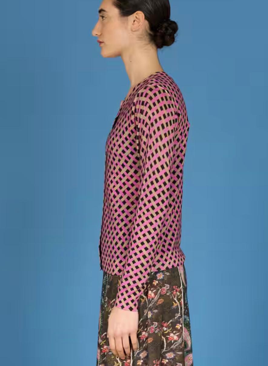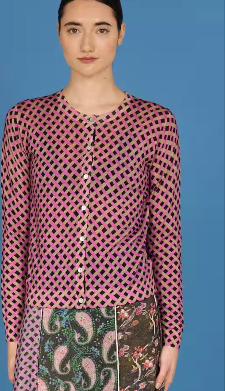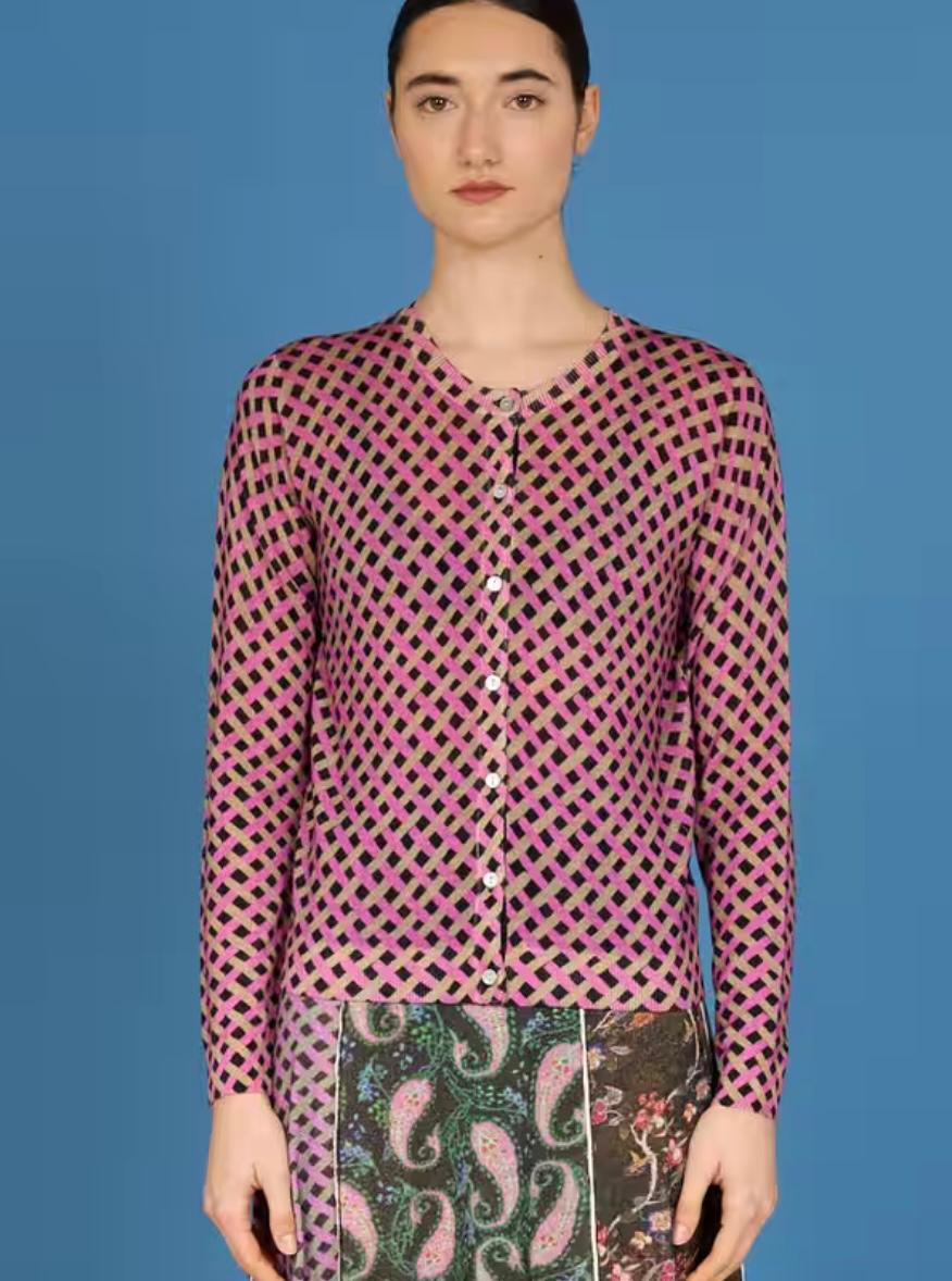 Golfino giro collo di linea Slim chiuso da bottoni in madreperla ,Realizzato in morbida lana merinos stampata a piccole losanghe bordeaux, naturale, fuxia