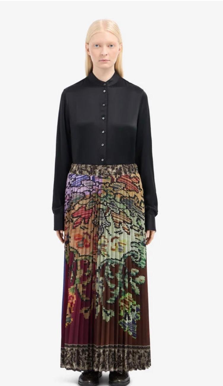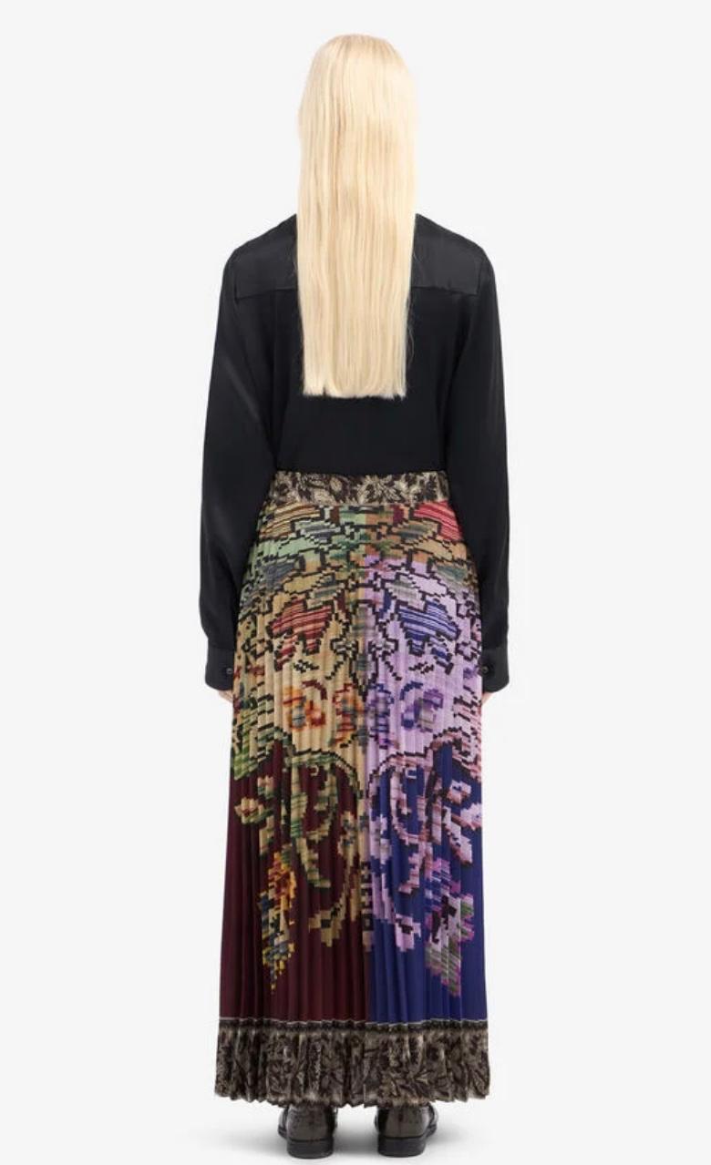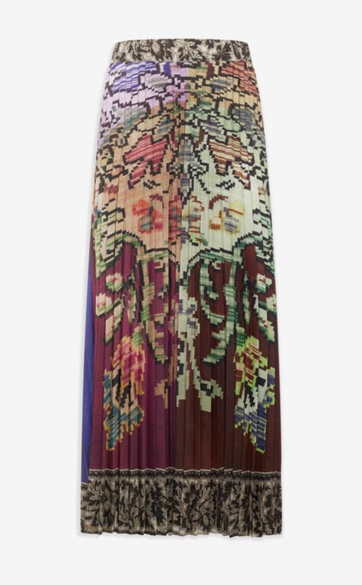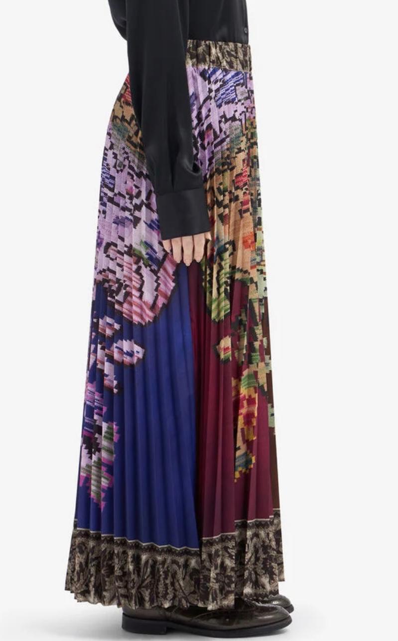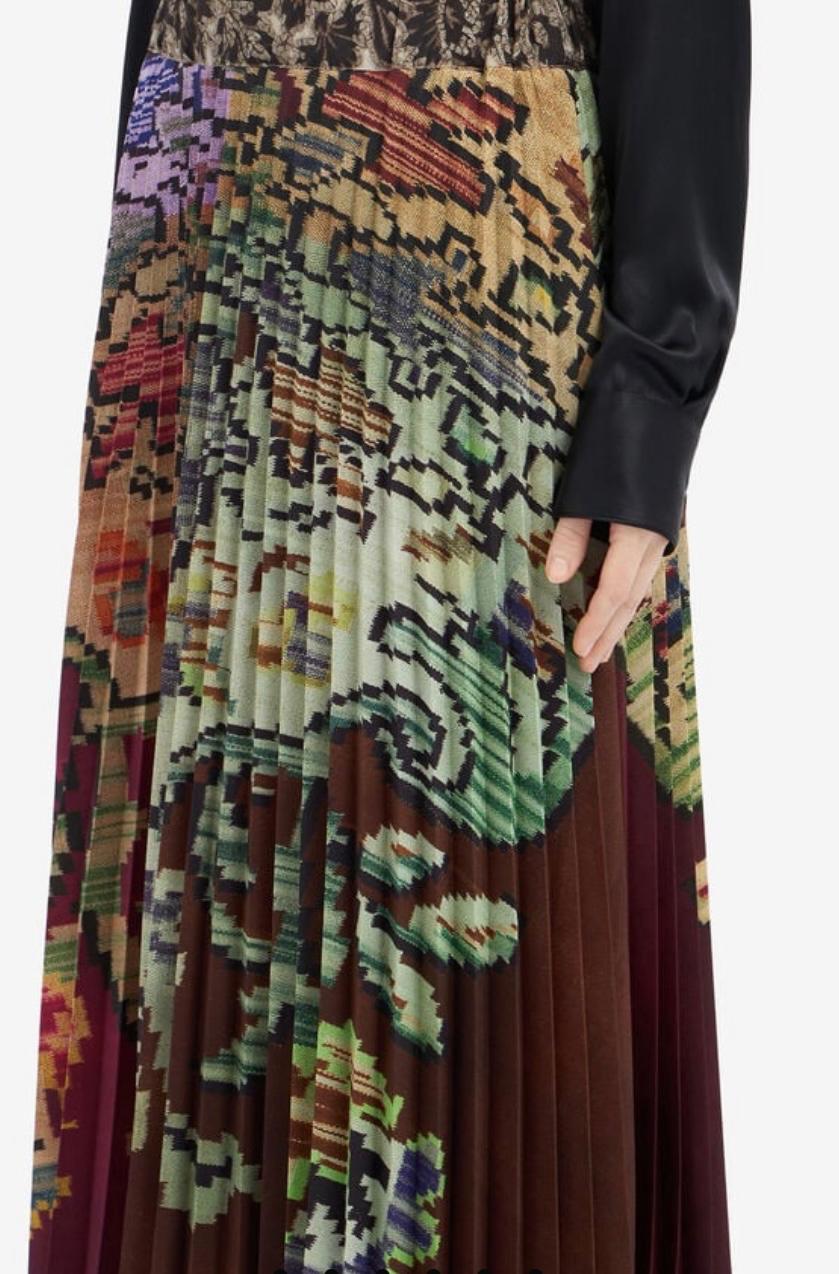 Gonna lunga plisse ‘ in tessuto poliestere fluido con stampa geometrica astratta multicolor sui toni del verde , bordeaux , bleu , rosa
