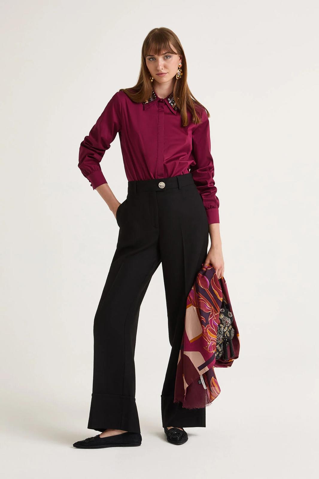 Pantaloni a vita regolare , gamba larga , realizzato in un tessuto morbido , alto risvolto al fondo , fascione in vita , alto, chiuso da bottone particolare