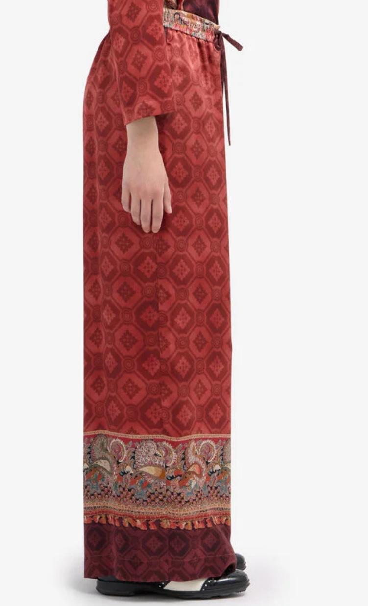 stampa geometrica tono su tono e bordo con fantasia in contrasto in cintura e al fondo