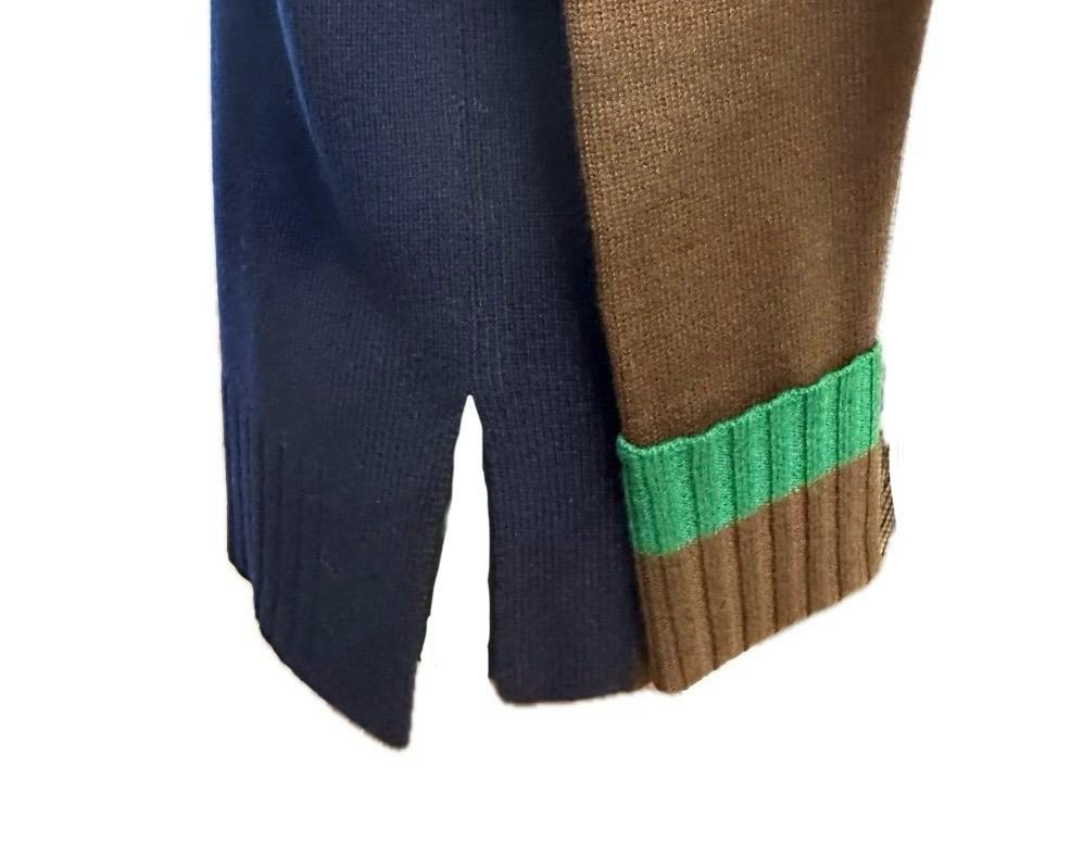 Pull girocollo con volume regolare , spacchi laterali, marrone caldo sul davanti con il dietro bleu e dettaglio verde sul polso