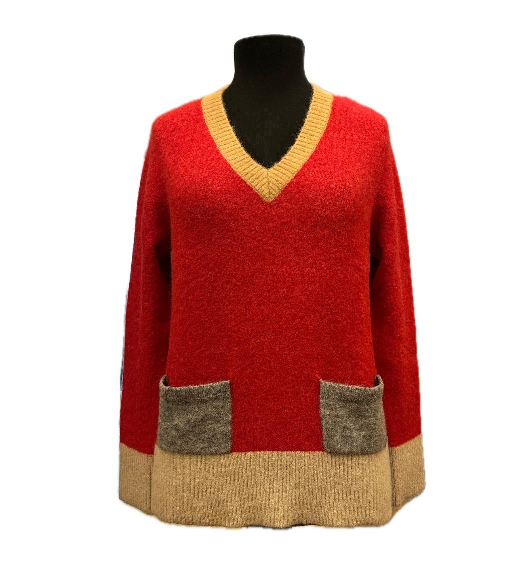 Pull scollo V in alpaca con colori in contrasto , patch Su fondo rosso , tasche grigie e bordi beige