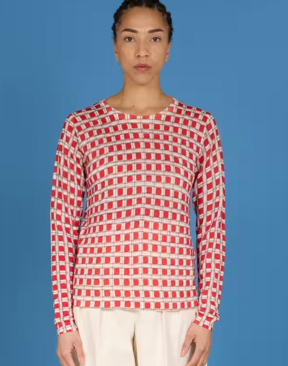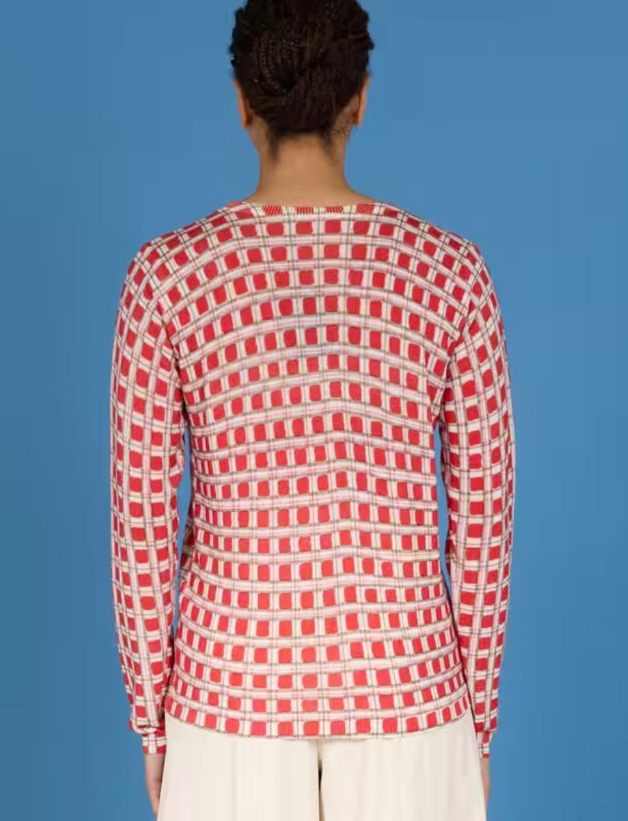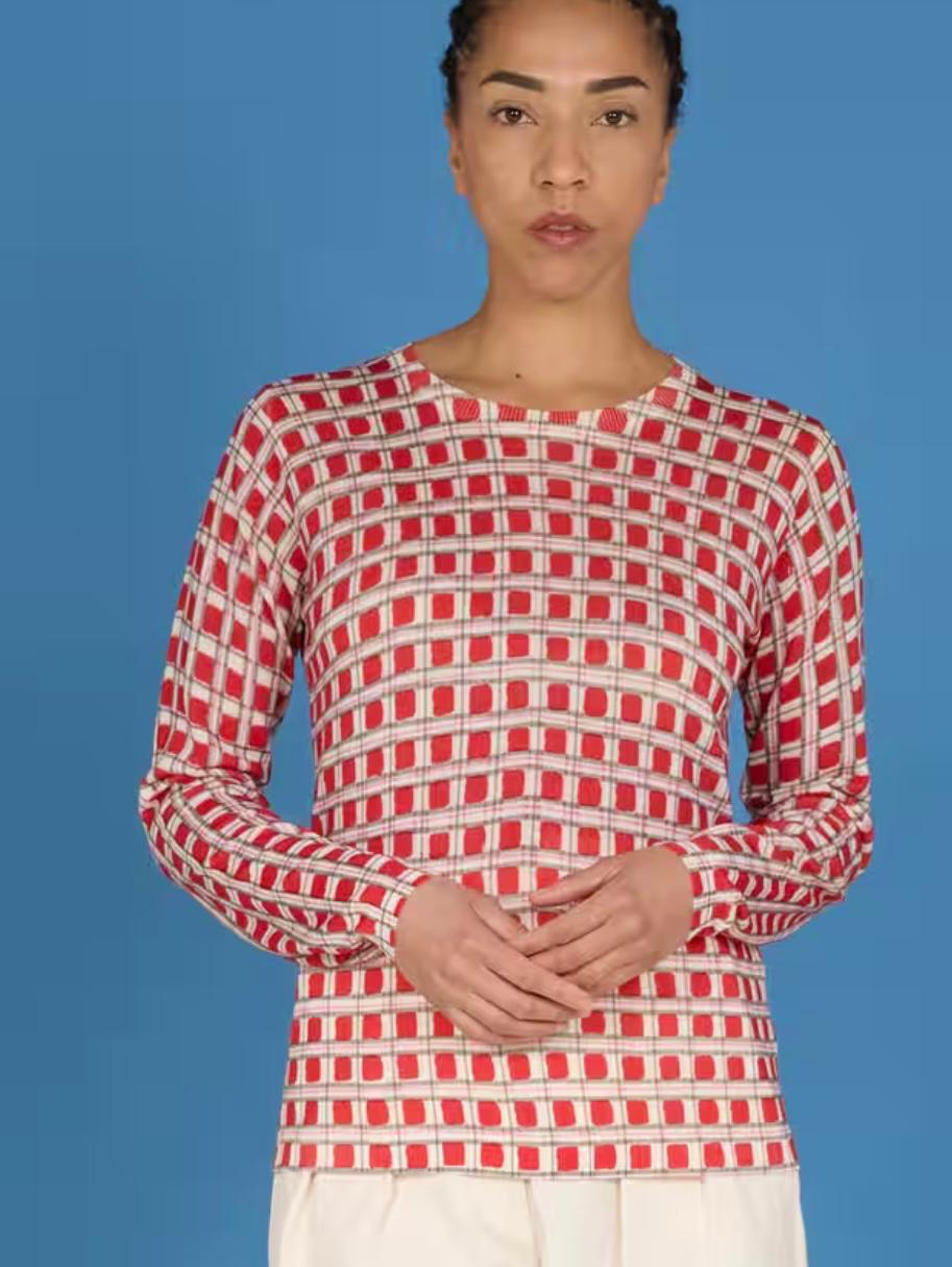 Maglia giro collo realizzata in morbido merinos con stampa a quadretti rossi su fondo ecrue e linee geometriche grigie