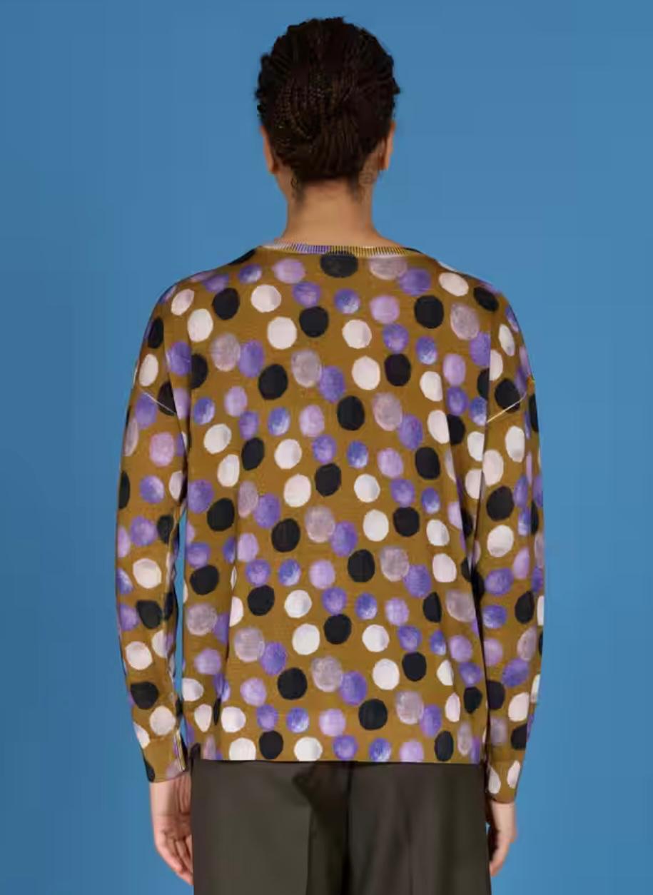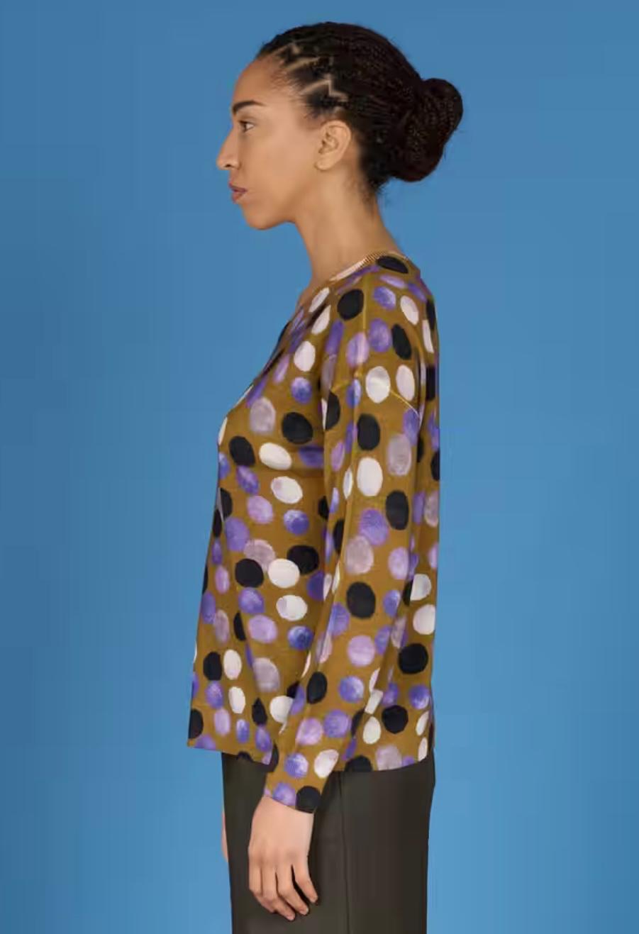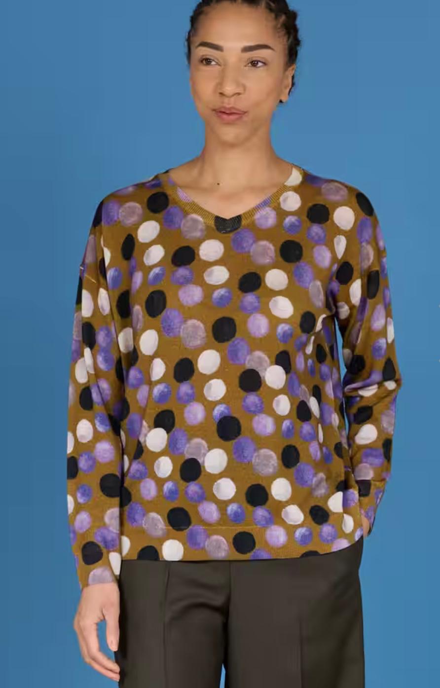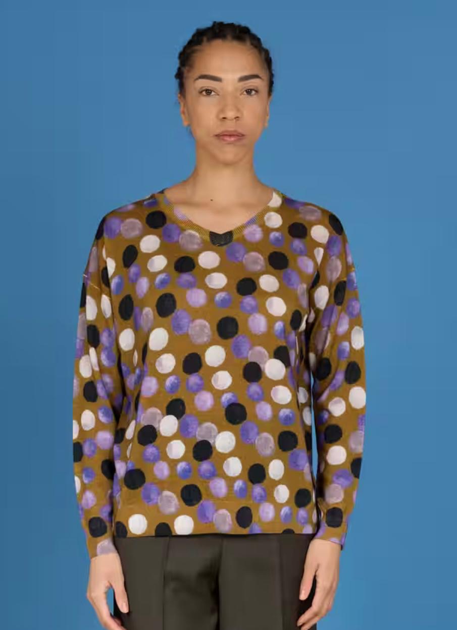 Maglia con piccolo scollo V realizzata in morbido merinos stampato a grossi pois in viola , naturale , nero su fondo marrone caldo