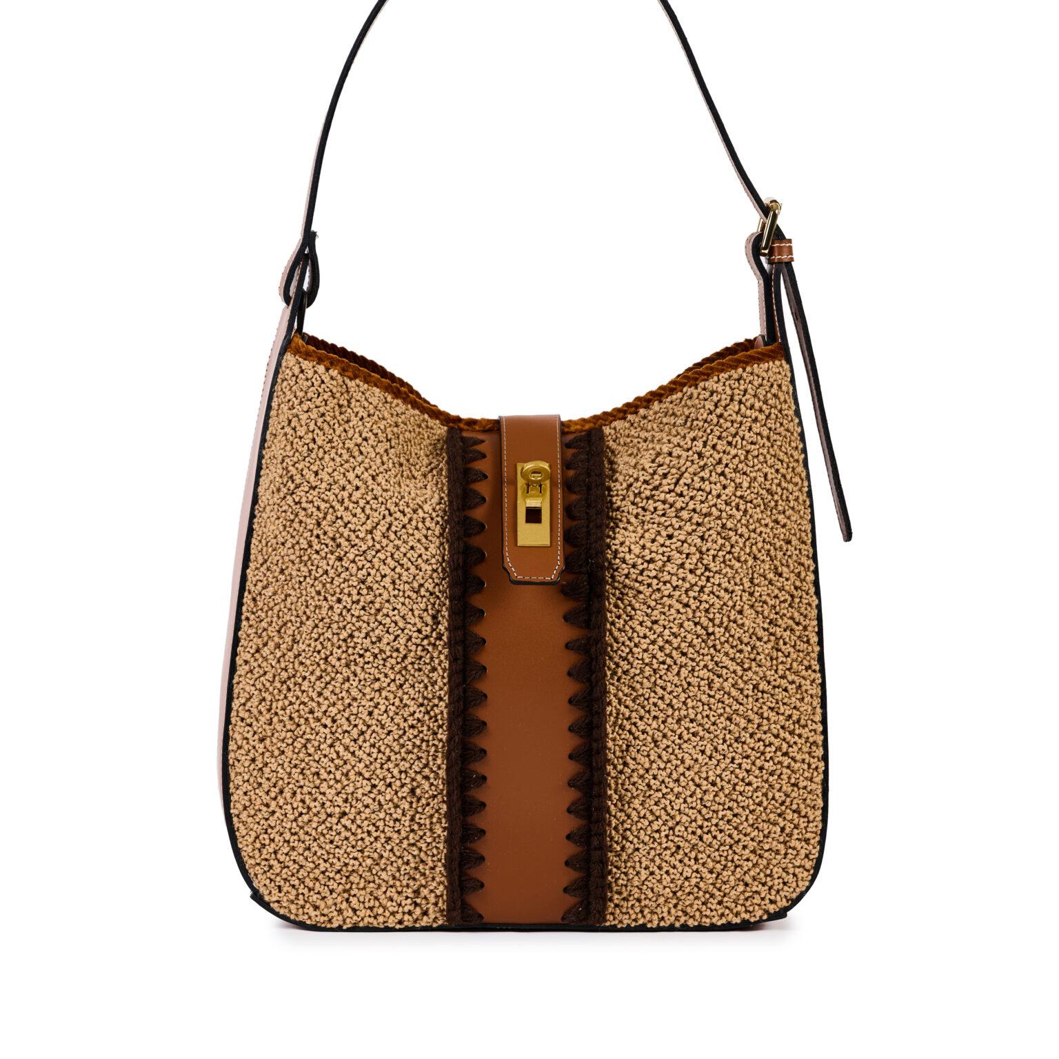 Borsa a spalla in lana boucle ‘ con infilatura e fibbia richiudibile , manico regolabile in pelle , tasca e busta interna