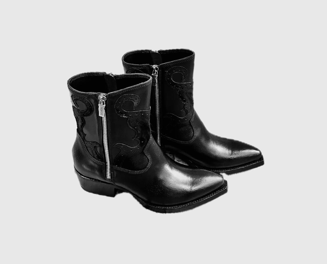 Texano in pelle nera a mezza gamba , con costruzione artigianale , con doppie cerniere laterali
